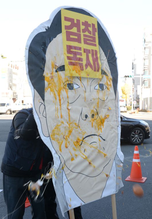 민주노총 울산지역본부가 9일 울산 남구 국민의힘 울산시당앞에서 윤 대통령 탄핵 부결! 국민의힘 규탄!을 촉구하는 기자회견 뒤 계란던지기 퍼포먼스를 하고 있다. |