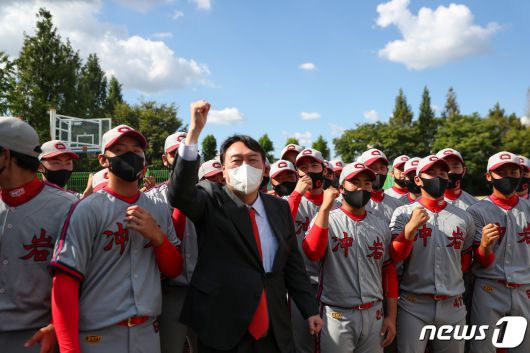 국민의힘 대선 주자인 윤석열 전 검찰총장이 8일 오후 모교인 충암고를 방문해 창단 후 처음으로 청룡기 전국고교야구선수권 대회를 우승한 야구부 선수들과 파이팅을 외치고 있다. (윤석열 캠프 제공) 2021.9.8/뉴스1 ⓒ News1 이동해 기자 |