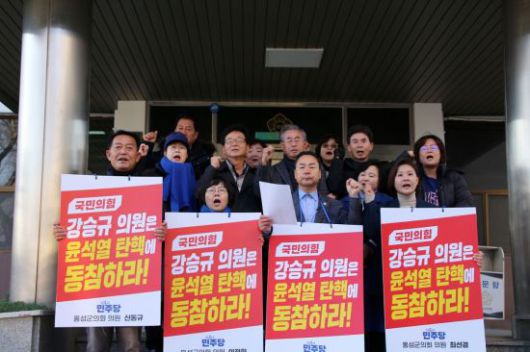 충남 홍성군의회 더불어민주당 의원들이 윤석열 대통령 탄핵안 투표에 불참한 강승규 국회의원(충남홍성예산·국힘)을 비난했다.