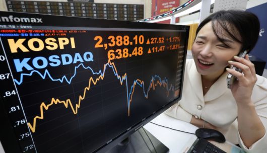 10일 오전 서울 여의도 한국거래소 전광판에 증시 시황이 표시되고 있다. 이날 코스피는 전 거래일 종가와 비교해 27.52포인트(1.17%) 오른 2388.10에, 코스닥은 11.47포인트(1.83%) 오른 638.48에 각각 거래를 시작했다. /사진=뉴스1. |
