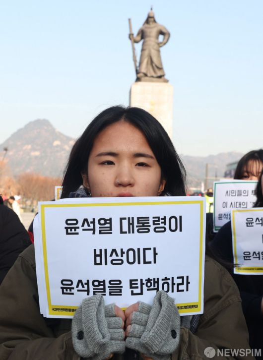[서울=뉴스핌] 이호형 기자 = 제76회 세계인권선언의 날 기념 인권운동 공동 기자회견이 10일 오전 서울 종로구 광화문광장서 열린 가운데 국가인권위원회 바로잡기 공동행동 등 참석자들이 손피켓을 들고 회견에 참여하고 있다.2024.12.10 leemario@newspim.com
