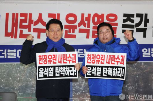 [무안=뉴스핌] 조은정 기자 = 김영록 전남지사가 지난 9일 전남도의회 '윤석열 대통령 퇴진 탄핵 촉구' 단식 농성장을 찾아 신민호(더불어민주당·순천6) 전남도의회 더불어민주당 원내대표와 '윤석열 탄핵'을 외치고 있다. 2024.12.10 ej7648@newspim.com |