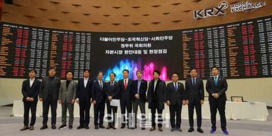 [이데일리 김응태 기자] 더불어민주당, 조국혁신당, 사회민주당 등 야 3당 국회 정무위원회 소속 12명의 의원들이 자본시장 현안을 점검하기 위해 한국거래소를 찾았다. 윤석열 대통령의 비상 계엄 사태에 따른 정치적 불확실성이 고조되며 증시 변동성 커진 탓이다. 의원들은 국내 증시가 안정되려면 윤석열 대통령 탄핵으로 정치적 불확실성을 빠르게 제거해야 한다고 주장했다.