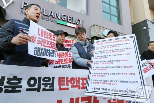 (서울=뉴스1) 민경석 기자 = 송파연대회의 관계자들이 10일 오전 서울 송파구의 배현진 국민의힘 의원 사무실 앞에서 '배현진·박정훈 의원 탄핵표결 촉구 기자회견'에서 '윤석열 탄핵촉구 송파주민 포고령'을 낭독하고 있다. 이날 참가자들은 윤석열 대통령 탄핵 표결에 참여하지 않은 배 의원을 규탄하며 포고령을 배 의원 사무실 출입문 옆에 붙였다. 2024.12.10/뉴스1