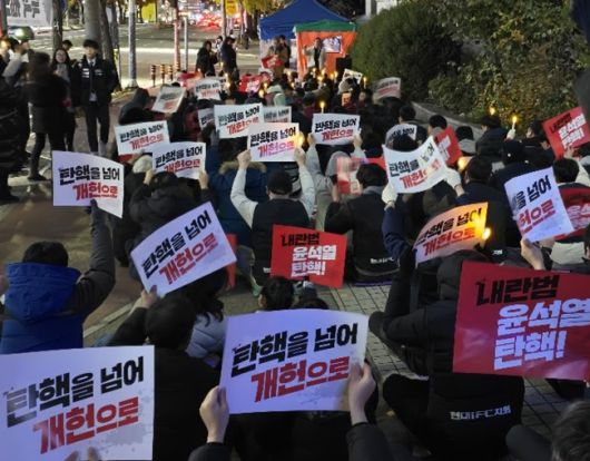 순천지역 시민사회단체와 시민들이 지난 3일 밤 윤석열 대통령의 계엄령 선포 이후 연향동 국민은행 사거리에서 윤 대통령의 탄핵을 촉구하고 있다. |