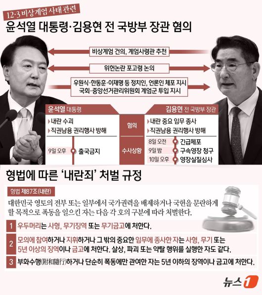(서울=뉴스1) 양혜림 디자이너,김지영 디자이너 = 검찰은 구속영장 청구서에 김용현 전 장관이 윤석열 대통령과 '공모 관계'에 있다고 적시한 것으로 알려졌다. 형법 87조 내란죄는 △수괴(우두머리) △모의에 참여하거나 지휘하거나 그 밖의 중요한 임무에 종사한 자 △부화수행하거나 단순히 폭동에만 관여한 자 등에 대해 처벌하도록 규정돼 있다. 김 전 장관의 경우 검찰은 내란 중요 임무 종사를 근거로 혐의를 적용했다. 이날 구속영장이 발부된다면 윤 대통령에 대한 수사도 한층 속도가 빨라질 것으로 보인다.