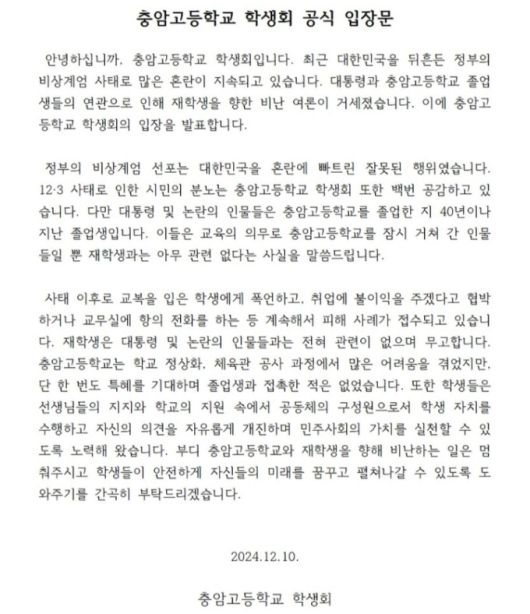 충암고 학생회는 10일 소셜미디어(SNS)에 공식 입장문을 내고 "정부의 비상계엄 선포는 대한민국을 혼란에 빠트린 잘못된 행위"라며 "12·3 사태로 인한 시민의 분노는 충암고 학생회 또한 백번 공감하고 있다"고 밝혔다.