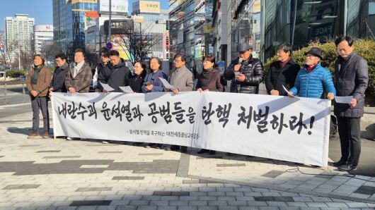 윤석열 탄핵을 촉구하는 대전세종충남교수 일동은 10일 대전 서구 은하수네거리 국민은행 앞에서 긴급 기자회견을 열고 "내란수괴 윤석열과 공범들을 탄핵 처벌하라"는 성명서를 발표하고 규탄했다.