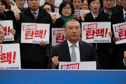 10일 지역 정치권에 따르면 지난 9일 오후 광주 동구 5·18민주광장에서 의원들은 12·3 내란 사태의 주범인 윤석열 대통령 즉각 탄핵과 검찰의 엄정한 수사를 촉구하는 공동 성명을 발표했다.