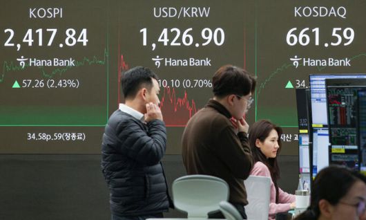 비상계엄령의 여파로 연일 국내 주가가 하락세를 보이는 가운데 10일 서울 중구 하나은행 딜링룸에 지수가 표시되고 있다. 이날 코스피 지수는 전 거래일 대비 57.26p(2.43%) 상승한 2,417.84, 코스닥 지수는 34.58p(5.52%) 상승한 661.59, 달러·원 환율은 전일 종가 대비 10.1원 내린 1426.9원에 장을 마감했다. 최상수 기자 |