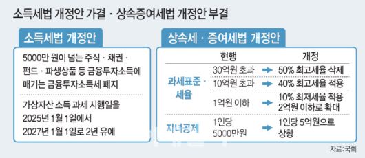 야당인 더불어민주당은 이 같은 정부의 개정안을 ‘부자 감세’라고 비판해왔다. 특히 올해 30조원 가까운 세수 결손이 나오게 된 상황을 지적하며 정부의 세법 개정안이 내년도 세입에까지 부정적인 영향을 끼칠 것이라고 주장하기도 했다. 이에 상속세 최고세율 인하에는 반대 입장을 표명했고, 인적 공제 확대에 대해서는 협의의 가능성을 열어뒀지만 지난 3일 계엄령의 여파로 관련 논의가 중단돼 결국 최종 부결로 결론났다.
