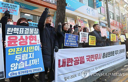 (인천=연합뉴스) 홍현기 황정환 기자 = 인천 시민단체가 '탄핵을 반대해도 시간이 지나면 지지해준다'는 취지의 발언을 한 국민의힘 윤상현 의원과 대통령 탄핵소추안 표결에 불참한 같은 당 배준영 의원의 사퇴를 촉구했다.