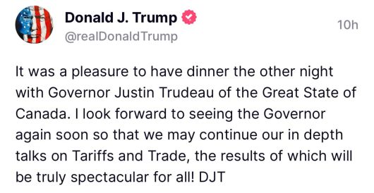 도널드 트럼프 당선인이 자신의 소셜미디어인 트루스소셜에 캐나다를 ‘주(州)’로, 쥐스탱 트뤼도 캐나다 총리를 ‘주지사’로 표현한 글을 올렸다. 트럼프는 지난달 트뤼도와 만난 자리에서 “(캐나다가) 미국의 51번째 주가 되는 것은 어떠냐”고 말한 적이 있다. 트럼프 당선인은 10일 올린 글에서 “지난번 위대한 캐나다주(State) 쥐스탱 트뤼도 주지사(Governor)와의 만찬은 즐거웠다”면서 “관세와 무역에 대한 깊이 있는 대화를 이어갈 수 있도록 주지사를 곧 다시 만나기를 기대한다”고 썼다. ‘주지사’라는 표현이 두 번 들어가는 것으로 보면 트럼프 당선인은 의도적으로 이 표현을 쓴 것으로 보인다.