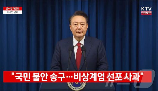 윤석열 대통령이 7일 서울 용산 대통령실 청사에서 계엄 선포 관련 대국민 담화를 하고 있다. (KTV 캡처) 2024.12.7/뉴스1 ⓒ News1 송원영 기자 |