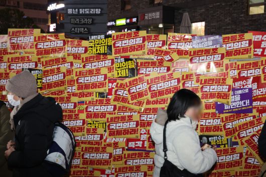 10일 오후 서울 영등포구 국민의힘 당사 앞에 촛불집회를 마친 시민들이 붙인 윤석열 대통령 탄핵, 국민의힘 해체 등을 촉구하는 팻말들이 붙어 있다. 연합뉴스 |