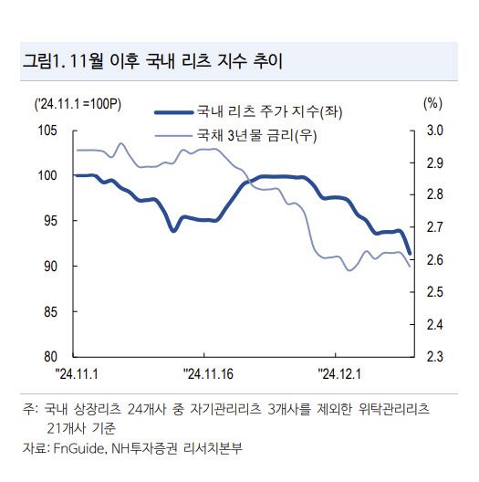 이은상 NH투자증권 연구원은 11일 보고서를 통해 “국내 리츠 지수는 유상증자 일정이 마무리된 이후 반등을 모색했으나 국내 정치적 불확실성 확대에 따른 기관·외국인의 순매도로 11월 1일~12월 10일 기간수익률 -8.6%를 기록했다”고 밝혔다 .
