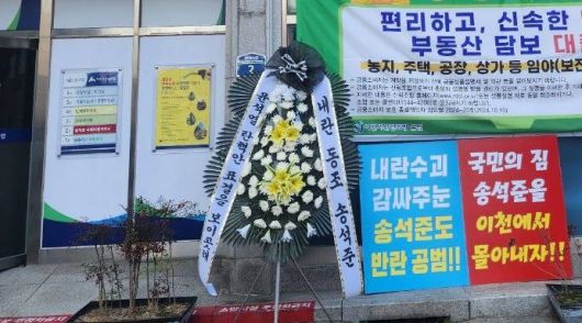 근조화환에는 ‘윤석열 탄핵안 표결을 보이콧해 내란 동조 송석준’이라는 글이 적혀 있었다. 이 화환은 집회가 끝난 직후인 오전 11시30분쯤 불상의 인물 2명이 나타나 치운 것으로 알려졌다.