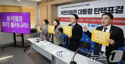 (서울=뉴스1) 김진환 기자 = 경제정의실천시민연합 관계자들이 11일 오전 서울 종로구 경실련 강당에서 기자회견을 열고 헌법을 유린한 비상계엄의 진상 규명과 국민의힘의 윤석열 대통령 탄핵 찬성을 촉구하고 있다. 2024.10.8/뉴스1