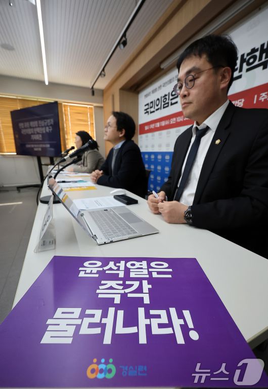 (서울=뉴스1) 김진환 기자 = 경제정의실천시민연합 관계자들이 11일 오전 서울 종로구 경실련 강당에서 헌법을 유린한 비상계엄의 진상 규명과 국민의힘의 윤석열 대통령 탄핵 찬성을 촉구하는 기자회견을 하고 있다. 2024.10.8/뉴스1kwangshinQQ@news1.krCopyright ⓒ 뉴스1. All rights reserved. 무단 전재 및 재배포, AI학습 이용 금지.