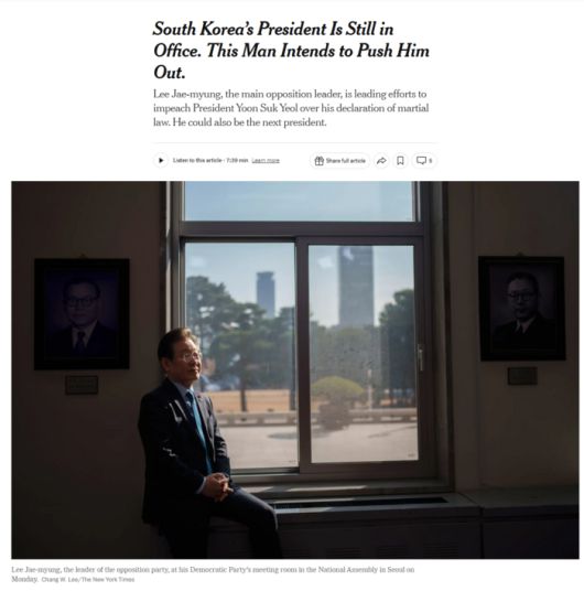 NYT는 10일자 ‘한국의 대통령은 여전히 자리에 있다. 이 남성은 그를 밀어내려 한다’(South Korea‘s President Is Still in Office. This Man Intends to Push Him Out) 제하 기사를 통해 이 대표의 계엄 사태 속 행보를 조명했다.