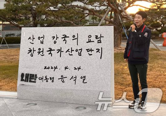 (창원=뉴스1) 윤일지 기자 = 지난 10일 경남 창원시 성산구 한국산업단지공단 경남지역본부 앞에 설치된 윤석열 대통령 휘호 표지석에 민주노총 경남본부가 래커로 '내란'이라는 글자를 표시했다. 해당 표지석은 지난 4월 창원국가산업단지 50주년 기념으로 설치됐으며, 현재는 가림막이 설치됐다. (민주노총 경남본부 제공) 2024.12.11/뉴스1