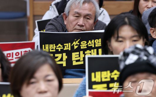 (서울=뉴스1) 김성진 기자 = 양대노총을 비롯한 시민단체 회원들이 11일 서울 종로구 향린교회에서 열린 '윤석열 즉각 퇴진·사회대개혁 비상행동 발족 기자회견'에서 손피켓을 들고 있다. 2024.12.11/뉴스1