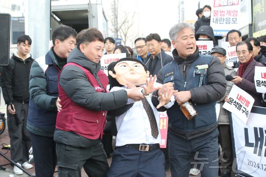 (울산=뉴스1) 김세은 기자 = 30여 개 시민사회단체와 5개 정당이 참여하는 윤석열 퇴진 울산운동본부 회원들이 11일 오전 국민의힘 울산시당 앞에서 윤 정권 탄핵 퍼포먼스를 펼치고 있다. 2024.12.11/뉴스1syk000120@news1.krCopyright ⓒ 뉴스1. All rights reserved. 무단 전재 및 재배포, AI학습 이용 금지.