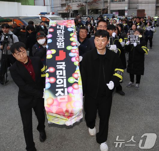 (부산=뉴스1) 윤일지 기자 = 윤석열 정권 퇴진 부산비상행동 구성원들이 11일 오후 부산 수영구 국민의힘 부산시당 앞에서 '내란공범 국민의힘 사망선고 장례식 기자회견'을 한 뒤 운구 퍼포먼스를 하고 있다. 2024.12.11/뉴스1yoonphoto@news1.krCopyright ⓒ 뉴스1. All rights reserved. 무단 전재 및 재배포, AI학습 이용 금지.