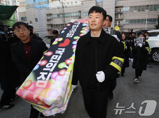 (부산=뉴스1) 윤일지 기자 = 윤석열 정권 퇴진 부산비상행동 구성원들이 11일 오후 부산 수영구 국민의힘 부산시당 앞에서 '내란공범 국민의힘 사망선고 장례식 기자회견'을 마친 뒤 운구 퍼포먼스를 펼치고 있다. 2024.12.11/뉴스1yoonphoto@news1.krCopyright ⓒ 뉴스1. All rights reserved. 무단 전재 및 재배포, AI학습 이용 금지.