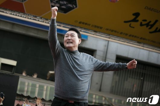 윤석열 국민의힘 대선후보가 제20대 대통령 선거를 하루 앞둔 8일 오후 대구 중구 서문시장에서 열린 '공정이 승리합니다' 유세에서 '어퍼컷 세리머니'를 하며 지지를 호소하고 있다. 2022.3.8/뉴스1 ⓒ News1 구윤성 기자 |