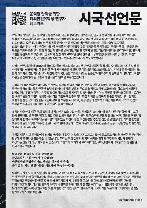 해외 19개국 138개 학교 유학생·연구자 300여명이 모인 단체 ‘윤석열 탄핵을 위한 해외 한인 유학생·연구자 네트워크’는 이날 시국선언문을 내고 “내란 수괴 윤석열에게 한시도 국가를 더 맡길 수 없다”며 즉각 탄핵을 주장했다. 이 시국선언문에는 현재까지 미국·영국·캐나다·중국·일본·독일·프랑스 등 총 18개국 49명이 발기인으로 참여했고 242명이 서명했다.