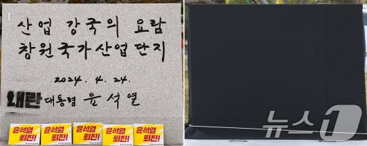 (창원=뉴스1) 윤일지 기자 = 지난 10일 경남 창원시 성산구 한국산업단지공단 경남지역본부 앞에 설치된 윤석열 대통령의 친필이 새겨진 표지석에 민주노총 경남본부가 '내란'이라는 글귀를 스프레이로 표시했다. 해당 표지석은 지난 4월 24일 창원국가산단 50주년을 맞아 창원시가 설치한 것으로 '산업강국의 요람 창원국가산업단지 2024. 4. 24. 대통령 윤석열'이라고 새겨져 있다. 현재는 창원시가 가림막을 설치한 상태다. (민주노총 경남본부 제공) 2024.12.11/뉴스1