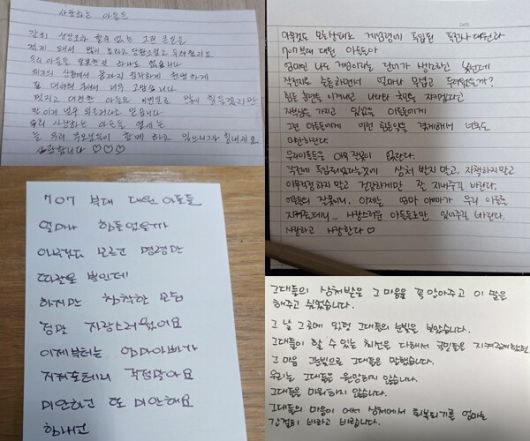 ‘여러분을 걱정하는 한 엄마’라고 밝힌 글쓴이는 “스스로를 책망하지 말아달라. 책망받아야 할 자들은 여러분들이 아니라 바로 나라와 국민을 배반한 윤석열과 그 부역자들”이라고 적었다. 또 다른 편지에는 “힘든 훈련을 이겨내고 나라와 국민을 지키겠다고 자부심을 가지고 있었을 아들들에게, 그런 아들들에게 이런 힘든 일을 겪게 해서 너무도 미안하다. 어른들의 잘못이니 작전에 투입됐다는 것에 상처 받지 말고 건강하게만 잘 지내주길 바란다”는 내용이 담겼다.