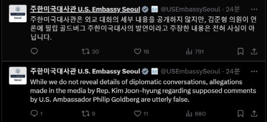 11일 오후 주한미국대사관은 소셜미디어 X(옛 트위터)에 “주한미국대사관은 외교 대화의 세부 내용을 공개하지 않지만 김 의원이 언론에 필립 골드버그 주한미국대사 발언이라고 주장한 내용은 전혀 사실이 아니다”라고 밝혔다.
