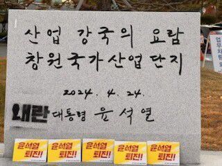 11일 한겨레 취재를 종합하면, 민주노총 경남지역본부는 지난 10일 경남 창원시 한국산업단지공단 경남지역본부 앞 대통령 표지석에 새겨진 윤석열 대통령 이름 앞에 검은색 스프레이로 ‘내란’이라는 글자를 썼다. 윤 대통령이 12·3 내란 사태 피의자인 상황을 드러낸 것이다. 지난 4월 창원국가산업단지 출범 50주년을 기념해 설치된 이 표지석에는 ‘산업 강국의 요람 창원국가산업단지 2024. 4. 24. 대통령 윤석열'이라는 글귀가 적혀 있었다. 민주노총 경남지역본부 관계자는 한겨레에 “대통령의 불법 계엄령에 대한 항의 차원”이라고 말했다. 민주노총 경남지역본부는 같은 날 경남 창원시 국민의힘 국회의원 4명의 지역구 사무실에 항의 방문하기도 했다.