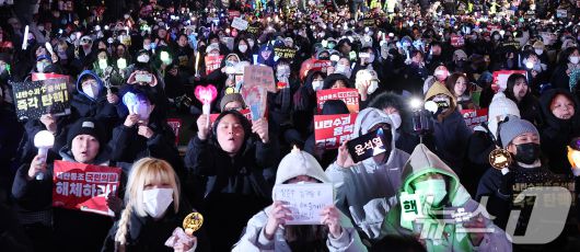 (서울=뉴스1) 김진환 기자 = 11일 오후 서울 영등포구 여의도 국회 앞에서 열린 '윤석열 즉각 탄핵 구속 촉구 촛불문화제'에서 참가자들이 응원봉과 손팻말을 들고 있다. 2024.12.11/뉴스1