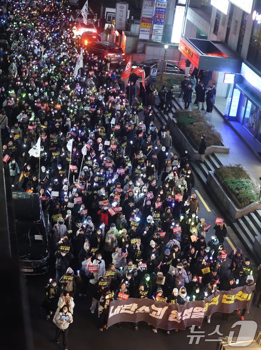 (서울=뉴스1) 김진환 기자 = 11일 오후 서울 여의도 국민의힘 당사 앞에서 응원봉과 손팻말을 든 시민들이 윤석열 대통령 탄핵과 국민의힘 해체를 촉구하고 있다. 2024.12.11/뉴스1kwangshinQQ@news1.krCopyright ⓒ 뉴스1. All rights reserved. 무단 전재 및 재배포, AI학습 이용 금지.