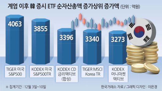 코스콤 체크에 따르면 3일(비상계엄 선포 당일)부터 10일까지의 ETF 순자산총액증가액은 TIGER 미국 S&P500가 4063억원으로 가장 많았다. TIGER 미국 S&P500는 10일 순자산총액이 3일 대비 7.04% 증가한 6조1763억원을 기록했다. 해당 ETF는 미국 증시에 상장한 시가총액 상위 500개 기업으로 구성된 미국 대표지수인 스탠더드앤드푸어스(S&P)500에 투자한다.