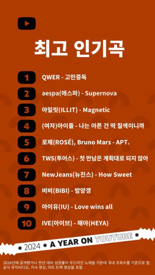 유튜브가 12일 발표한 '2024년 유튜브 트렌드 리포트'에 따르면, 올해 한국의 유튜브 트렌드는 팬덤 문화의 진화와 일상 기반 콘텐츠의 약진이 두드러진 것으로 나타났다. 유튜브는 인기 주제, 최고 인기 크리에이터, 최고 인기곡, 쇼츠 최고 인기곡 등 4개 부문의 연간 순위를 공개했다.