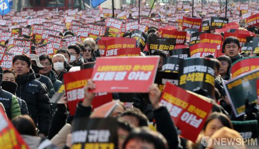 [서울=뉴스핌] 최지환 기자 = 윤석열 즉각 퇴진·사회대개혁 비상행동을 비롯한 노동시민단체 관계자들이 12일 오후 서울 중구 세종대로 일대에서 열린 '내란주범 윤석열 즉각 탄핵 구속! 내란동조 국민의힘 해체! 노동자 시민대회'를 열고 있다. 2024.12.12 choipix16@newspim.com |