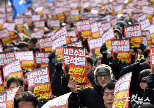 12일 오후 서울 중구 세종대로에서 열린 ‘내란주범 윤석열 즉각 탄핵·구속! 내란동조 국민의힘 해체! 노동자 시민대회’ 참가자들이 구호를 외치고 있다.