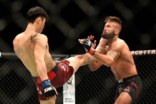 최두호가 UFC 페더급 4위까지 올라가는 제러미 스티븐스를 발로 차고 있다. 사진=USA TODAY=연합뉴스 제공 |