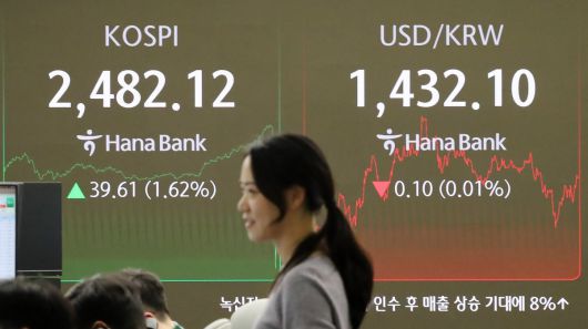 12일 오후 서울 중구 하나은행 본점 딜링룸 전광판에 코스피 지수와 원·달러 환율이 나타내고 있다. 이날 코스피 지수는 전 거래일 대비 39.61p(1.62%) 상승한 2,482.12, 코스닥 지수는 7.43p(1.10%) 오른 683.35로 장을 마감했다. 2024.12.12./뉴스1 |