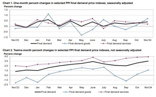 다만 변동성이 큰 식품과 에너지를 제외한 근원 PPI는 전월비 0.2% 증가해 예상에 부합했다. 여기에 무역서비스까지 제외한 PPI 증가율은 0.1%에 그쳤다. 11월에는 상품가격이 0.7%나 상승해 평균을 높였다. 통계국은 식품가격이 같은 기간에 3.1%나 급등한 것이 영향을 미친 것이라고 분석했다.