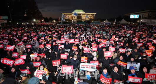 [이데일리 방인권 기자] 7일 서울 영등포구 여의도 국회 의원회관 앞에서 시민들이 윤석열 대통령의 탄핵소추안 투표 참여 촉구하고 있다. |