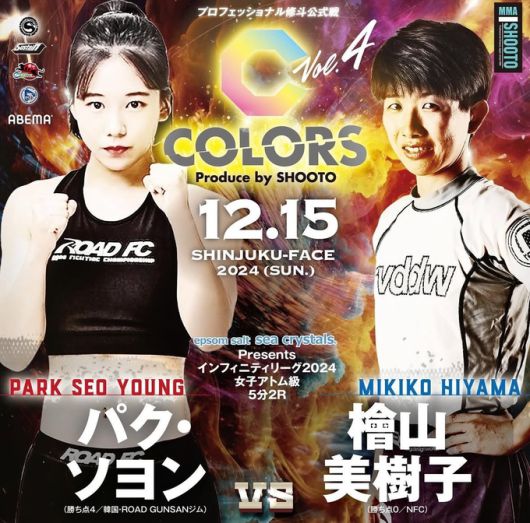 오는 15일 일본 도쿄 신주쿠에서 개최되는 Shooto Colors vol.4에 출전, 일본 파이터인 히야마 미키코와 대결한다. 박서영이 출전하는 경기는 여성 파이터 4명이 모여 경쟁하는 슈토 인피니티 리그다. 4명의 선수가 한 번씩 맞붙어 경기 결과로 우승자를 가려낸다. 1차전에서 히라타 아야네, 2차전에서 나리타 노에루를 꺾으며 2연승을 거두고 있는 박서영은 현재 1위를 달리고 있다.