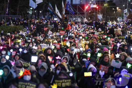(서울=뉴스1) 김진환 기자 = 윤석열 대통령에 대한 국회의 2차 탄핵소추안 표결을 하루 앞둔 13일 오후 서울 영등포구 여의도 국회 앞에서 열린 '윤석열 즉각 탄핵 구속 촉구 촛불문화제'에서 참가자들이 응원봉과 손팻말을 들고 있다. 2024.12.13/뉴스1