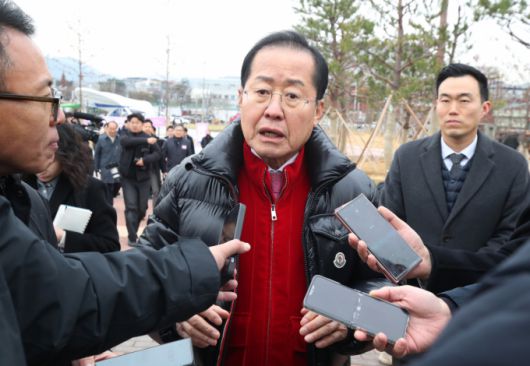 홍준표 대구시장이 윤석열 대통령 2차 탄핵소추안 표결을 하루 앞둔 13일 오전 대구 서구 서대구역에서 열린 대경선(대구경북선) 광역철도 개통식을 마친 뒤 취재진 질문에 답하고 있다./사진= 뉴스1 |