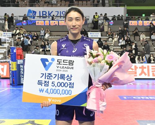 통산 5천득점은 이 부문 역대 1위(7천755점)인 양효진(현대건설)과 박정아(페퍼저축은행·5천896점), 황연주(현대건설·5천794점), 정대영(은퇴·5천653점), 한송이(은퇴·5천321점)에 이어 여섯 번째다.
