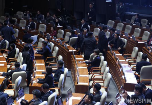 [서울=뉴스핌] 윤창빈 기자 = 14일 오후 서울 여의도 국회에서 열린 본회의에서 윤석열 대통령 탄핵소추안이 가결되자 국민의힘이 회의장을 나서고 있다. 2024.12.14 pangbin@newspim.com